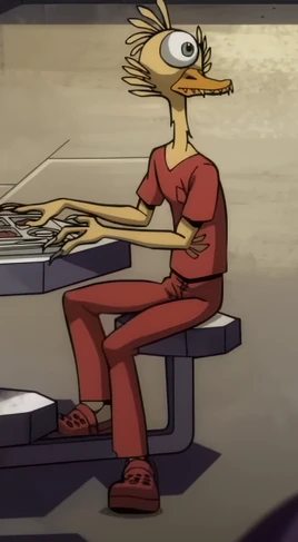 Rubberduck est un humanoïde avec des attributs d'un oiseau. Il a la tête d'un oiseau mais avec un seul œil, un pelage beige, trois doigts similaires à ceux des pattes d'un oiseau. Il a le corps menu.