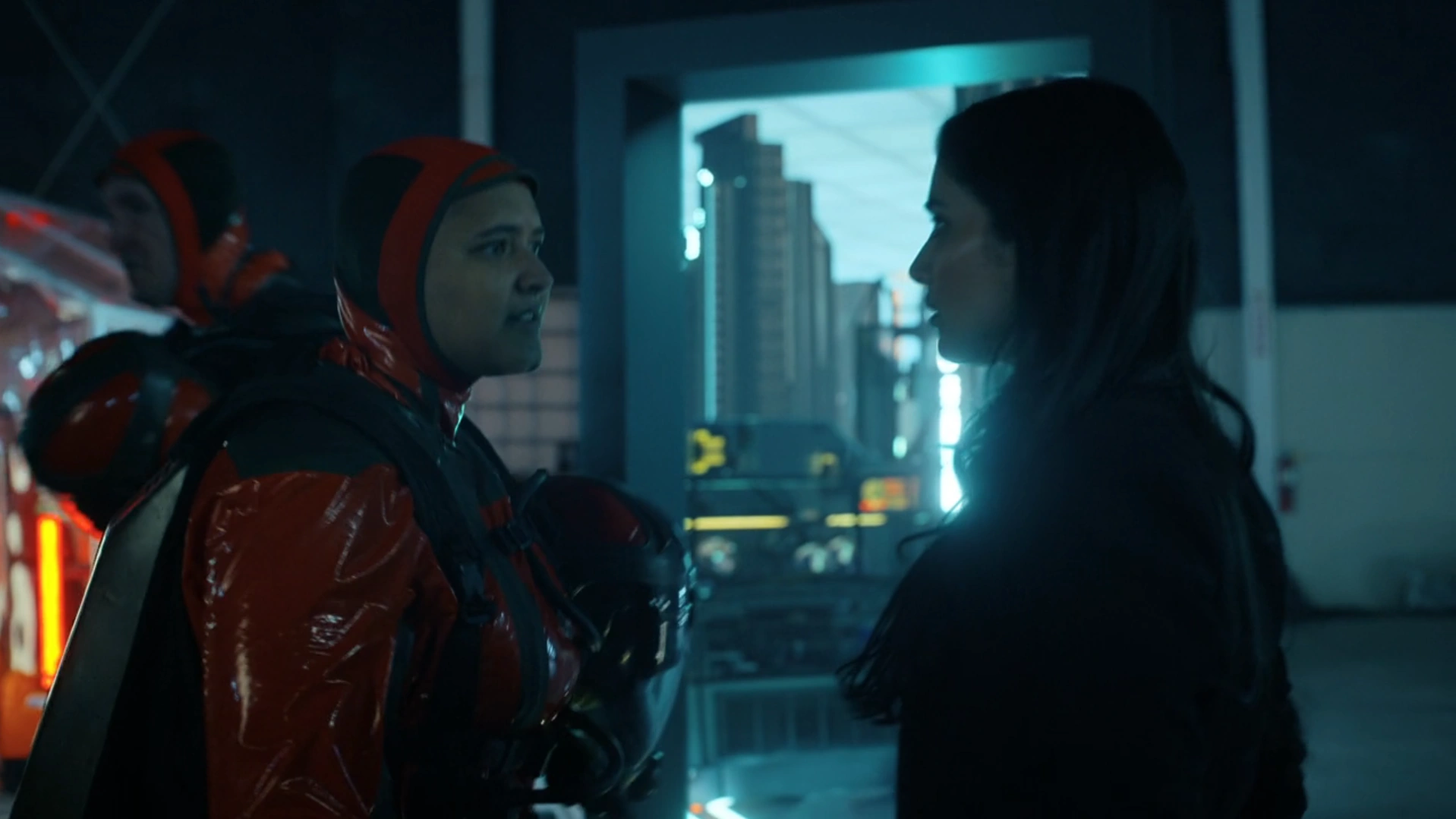 Angler was assigned to a mission to infiltrate Chris Smith's House and search for dimensional anomalies. While her partner smoked, Angler set up her gun and smiled at her partner. Angler then went to the house and got inside a truck across the street where they could monitor the house. Chris Smith left the house to go to a party, although mission leader Langston Fleury insisted that they wait to make sure Smith did not forget something at home and need to turn around. Angler corrected Fleury's use of the term "housewarming," thinking it meant any gift given at someone's home, agreeing with Vega when he said that he would not turn around when he forgot a gift. Fleury ordered them to wait, and Vega began bouncing his leg, which bothered Angler.