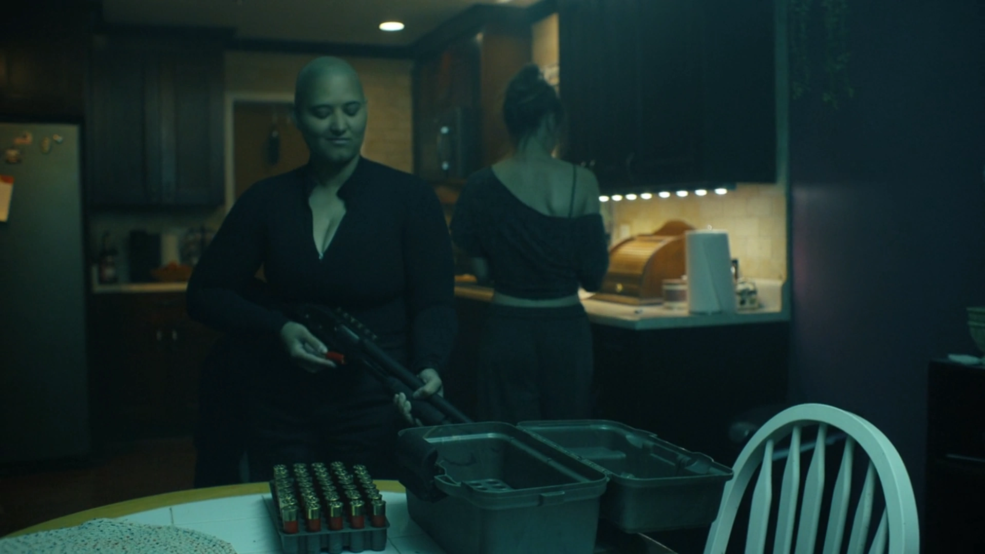 - Shotgun: Angler was armed during her Infiltration into Chris Smith's House, in which she used the gun to stand guard at the front door. However, she was unable to use it against Eagly.