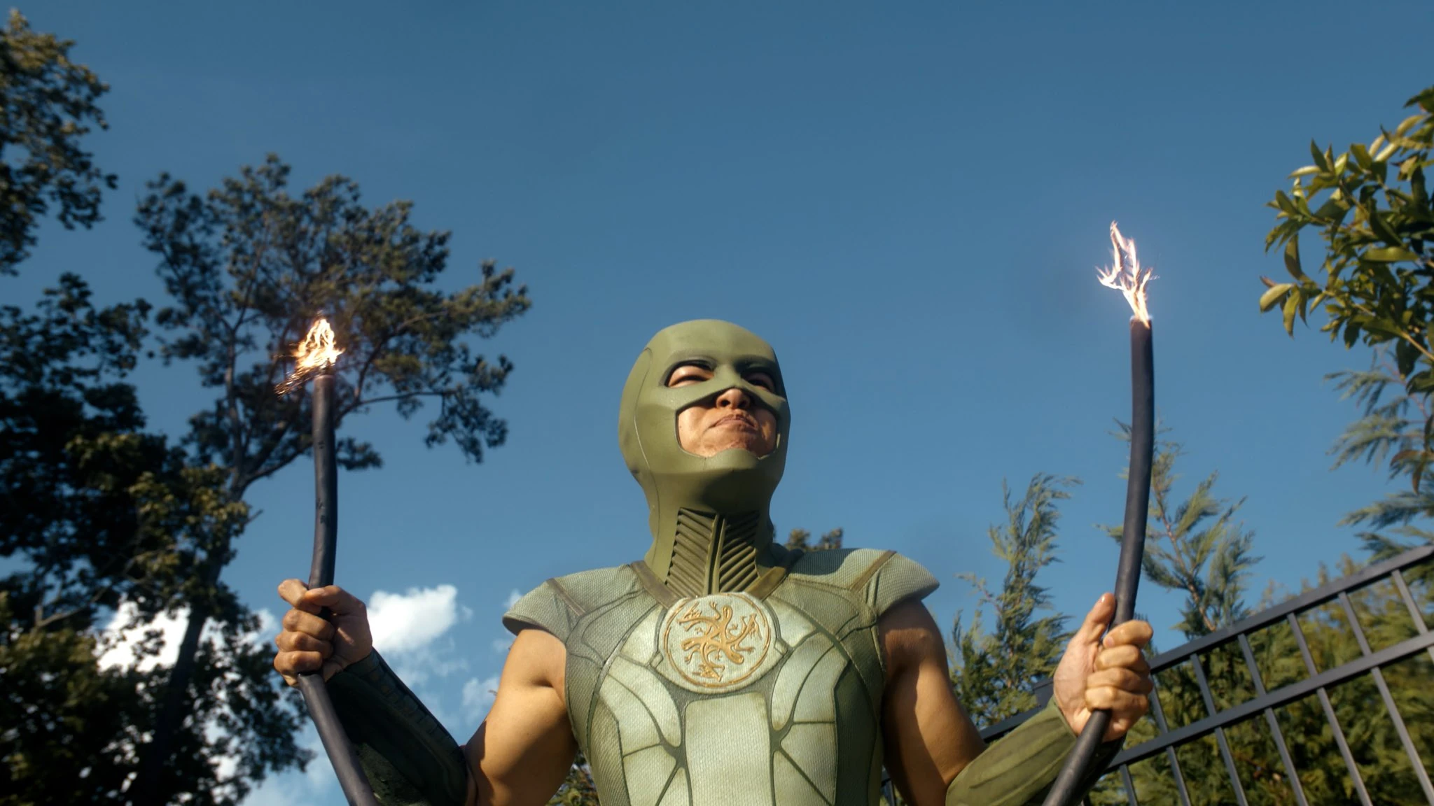 When a Kaiju appeared in Evergreen and began wreaking havoc on the city, Blue Dragon and Captain Triumph prepared to fight it, regrouping as the Top Trio with Peacemaker, who brought his new partner and pet, Eagly. The Top Trio and Eagly soared through the skies on their jetpacks before confronting the Kaiju, annihilating it, and saving Evergreen.[6]