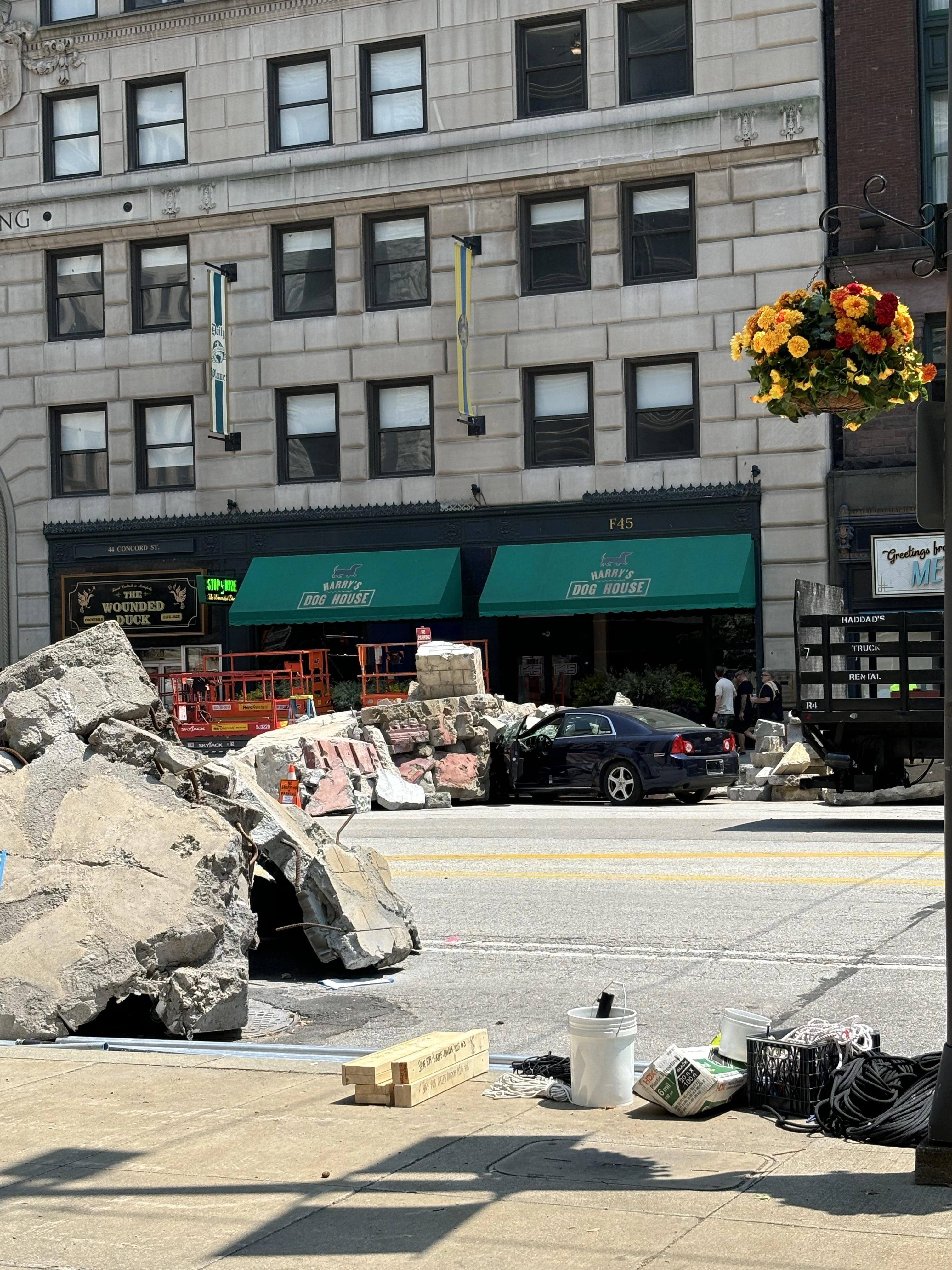During the Battle of Metropolis, debris fell onto the street in front of Harry's Dog House.[1]